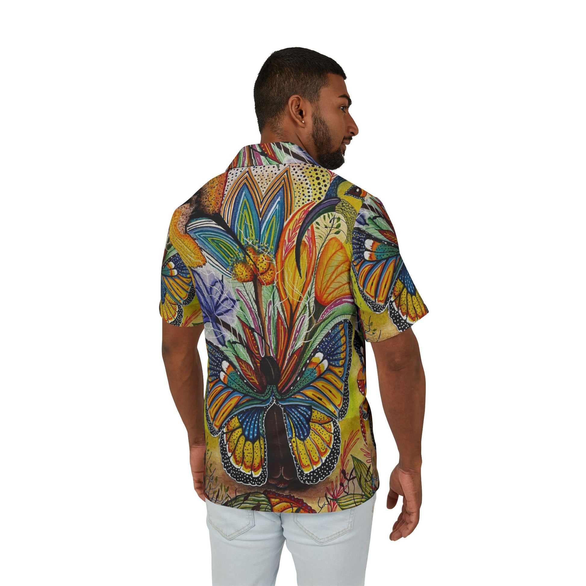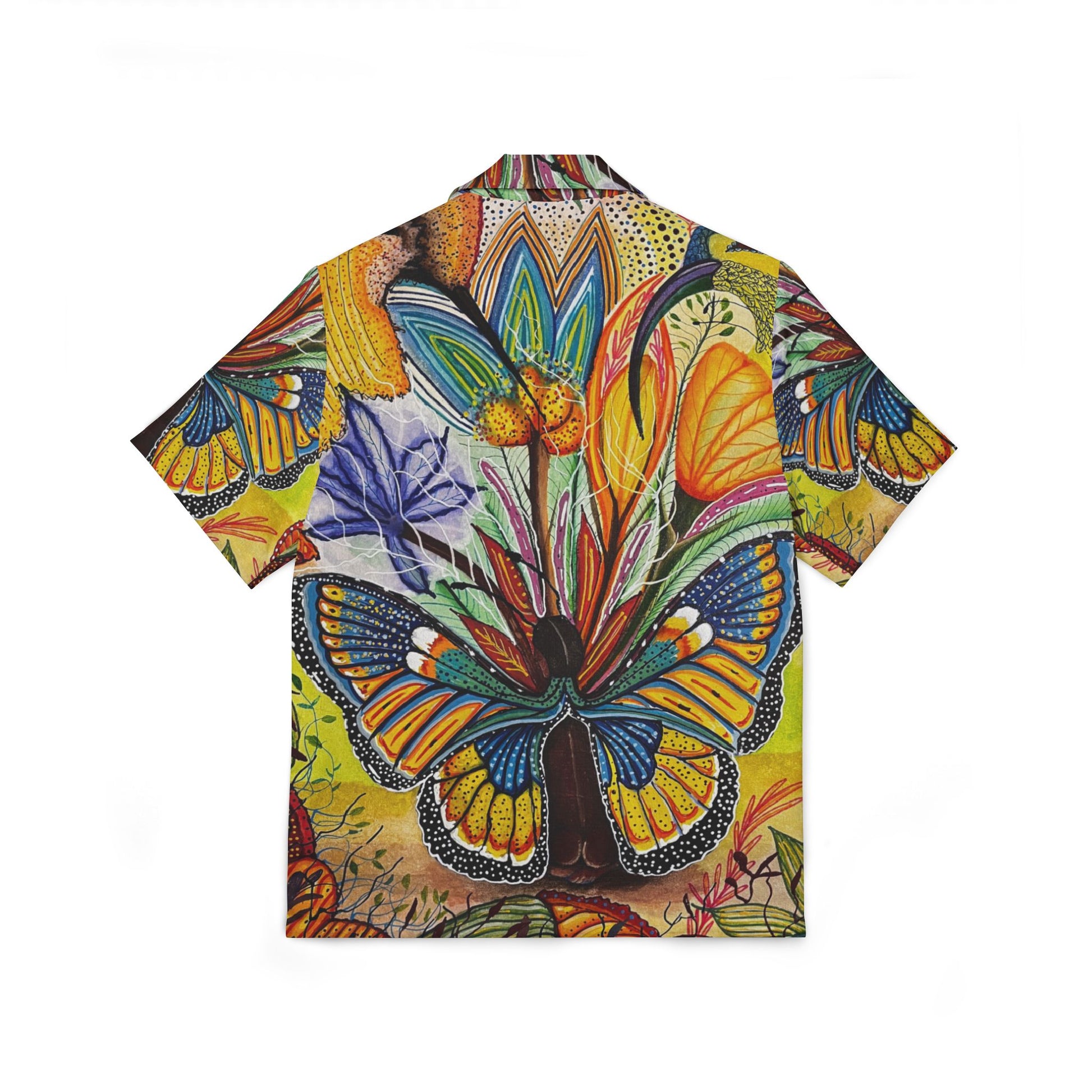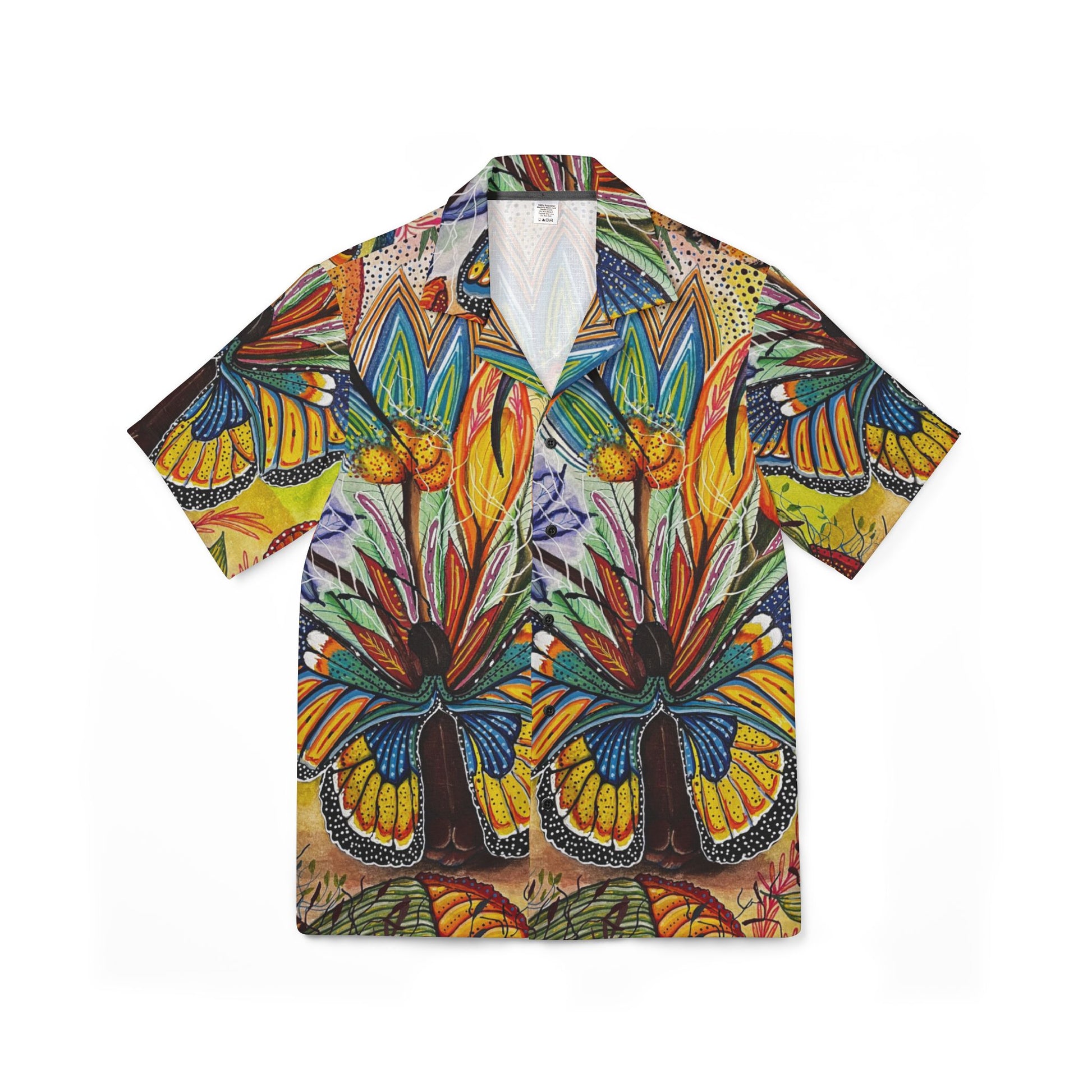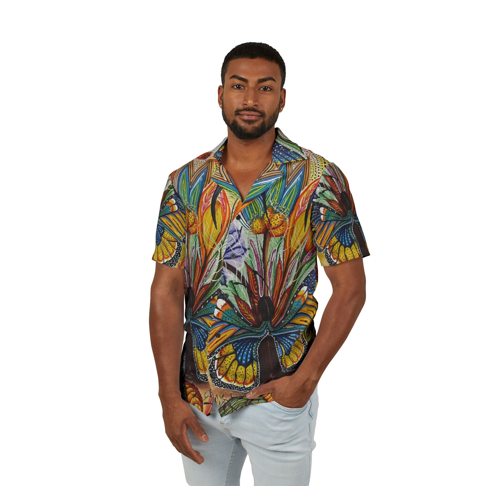 This shirt uplifts the spirits with its vibrant all-over print design, made with breathable 100% polyester fabric. It is perfect for those who appreciate artistic creativity and want to stand out in style. Ideal for casual wear or themed parties, this shirt is a great choice for summer days and tropical holidays.
